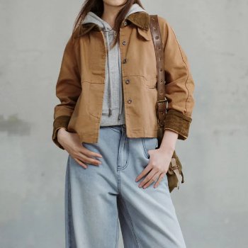 Retro Khaki Corduroy Collar Canvas Jacket for Women – Loose Fit Coat