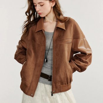 Women’s Retro Suede PU Leather Jacket with Turn-Down Collar for Fall Streetwear